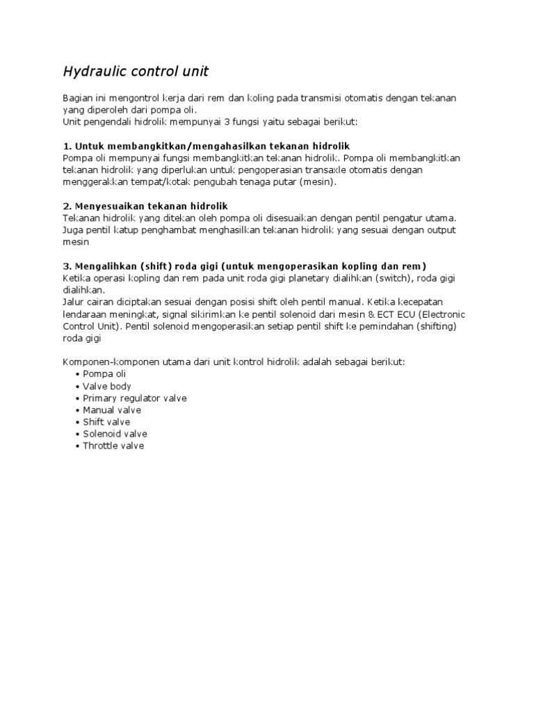 Bagian ini mengontrol kerja dari rem dan koling pada transmisi otomatis dengan tekanan yang diperoleh dari pompa oli. Unit pengendali hidrolik mempunyai 3 fungsi yaitu sebagai berikut. Hydraulic control unit Hydraulic control unit merupakan komponen transmisi otomatis yang berfungsi untuk mengontrol kerja dari rem dan kopling pada transmisi otomatis memakai tekanan yang dihasilkan dari pompa oli.