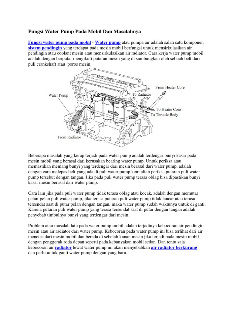 Fungsi water pump pada mobil. Suara ini diikuti dengan kebocoran pada air radiator yang cukup deras di bagian samping mesin kendaraan. Oleh karena itu tanpa adanya water pump maka air pendingin tidak mampu bersirkulasi dan dapat menyebabkan terjadinya panas berlebih atau yang. Fungsi water pump adalah untuk memompa air radiator agar bersirkulasi untuk menjaga suhu kerja mesin water pump pada mesin mobil secara umum digerakkan oleh drive belt atau ada yang mengatakan fan belt pada water pump terdapat puly yang terhubung oleh drive belt dengan putaran mesin.