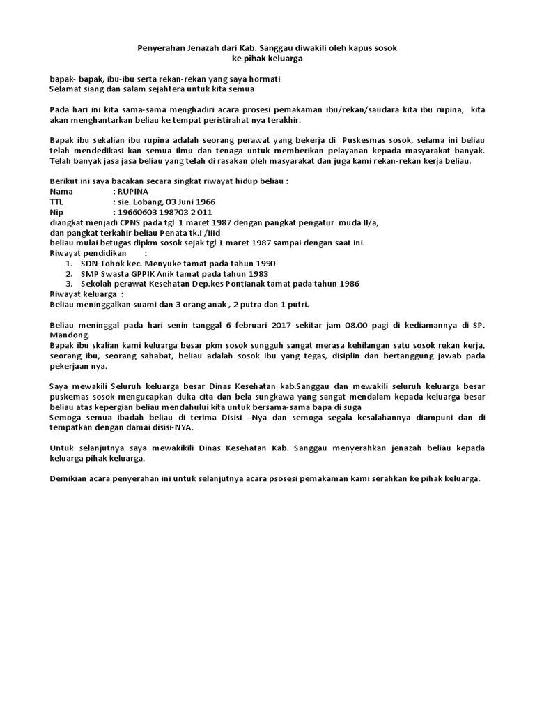 Tangis Gubernur Riau Lepas Jenazah Dokter Muda yang Meninggal. Contoh-Contoh Pidato dan MC Dalam Berbagai Acara oleh Drs. Hari ini kita berkumpul disini menyaksikan kuasa Allah bagi manusia melalui peristiwa kematian manusia.