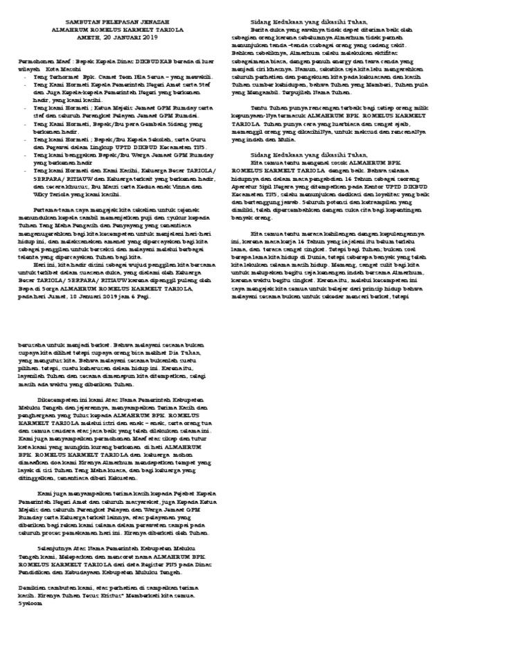 Inti dari tradisi upacara kematian sendiri tentu mempunyai maksud serta tujuan tertentu tergantung dengan agama atau kepercayaan yang dianut masing-masing. Jika kebetulan anda diberikan tanggung jawab untuk mengemban tugas tersebut. Contoh naskahteks sambutan sebagai pembawa acara mc ditulis oleh.